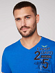 Особая структура пряжи и аутентичные аппликации CAMP DAVID задают особый стиль футболке. На лицевой стороне есть небольшое произведение искусства, а на спине - большое. Мужской V-образный вырез подчеркнут контрастным швом на плечах. Модель ростом 189 см носит размер. М.