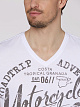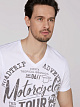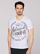 Как насчет повседневной футболки для вашего нового путешествия? Мужская футболка имеет V-образный вырез с открытым краем и стильные потертые принты спереди и сзади. Контрастная отстрочка на плечах и по бокам завершает образ. Модель ростом 187 см носит размер. М.