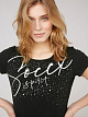 Футболка с круглым вырезом от SOCCX украшена принтом с логотипом звездного неба. Изображение состоит из блеска и фольгированного принта. Футболка из плотного и комфортного трикотажа с классическим круглым вырезом идеально сочетается с джинсами. Модель ростом 177 см носит размер. S.