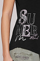 Красивая летняя футболка от SOCCX имеет небольшой вырез на круглой горловине и слегка приспущенные плечи вместо рукавов. Декоративные текстовые принты украшают левое плечо и правый подол спереди.