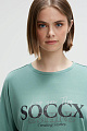 Футболка с логотипом SOCCX из модала создаёт великолепный образ. Специальный материал делает её гладкой и струящейся, а свободный крой обеспечивает комфорт. Рисунок украшен декоративными камнями, а так же имеет спущенные плечи и отворот.