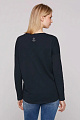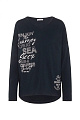 Слегка свободная рубашка с длинными рукавами имеет женственный V-образный вырез и удлиненную закругленную спинку. Спереди расположены принты с морскими надписями, а в верхней части спинки — небольшой якорь из страз.